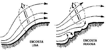 O encosta lisa faz com que a força de ascensão fique muito próximo ao solo. Ao contrário a encosta rugosa a a força de ascensão fica longe do solo. E próximo ao solo há turbulência.